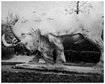 Передо мной старая фотография. Группа студентов Нефтяного института. Вторая слева в “модном ” клетчатом плаще – моя мама. На обороте надпись:“ЦПКиО 1952 год”. Я давно мучался вопросом – где, в каком месте был сделан снимок. Водились когда-то в парке такие звери, но сейчас и следа от них не осталось. И вот недавно благодаря сотрудничеству с сайтом www.oldmos.ru и лично с Olgara нашел ответ. Такой зубр (или бык) стоял справа от беседки, сооруженной в честь 800-летия Москвы. Люди любили там фотографироваться. Мне стало интересно, сохранились ли остатки какие нибудь на этом месте. Благодаря Olgara узнал, что точное расположение этого места в двух шагах от фонтанов, на заросшей площадке.
